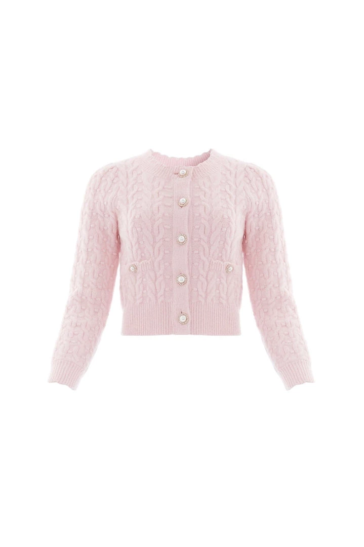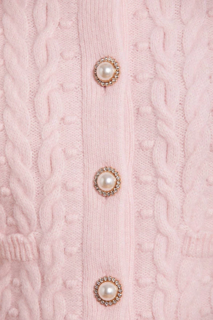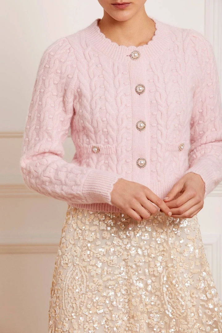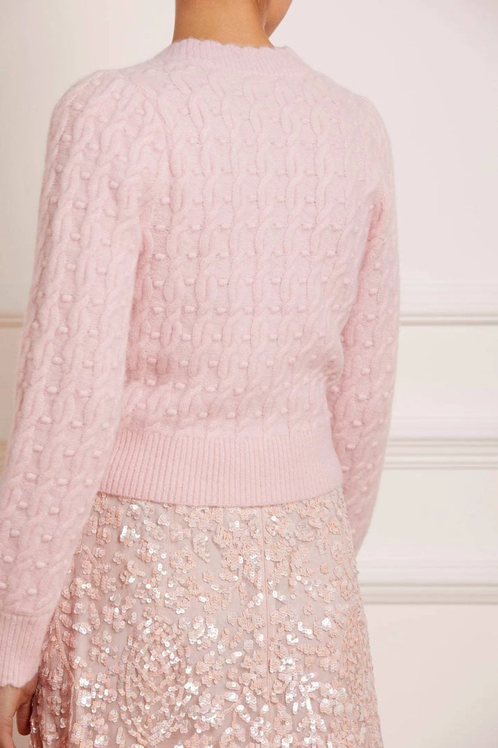NEEDLE & THREAD EXCLUSIVE. The Cable Bobble Short Cardigan in Petal Pink. This cardigan is crafted from soft alpaca yarn, resulting in a cosy, fluffy texture. Featuring intricate cables and bobbles to create a substantial, deeply tactile knit. Designed with faux pockets, crystal buttons and scallop detailing. Make this style a new wardrobe favourite.