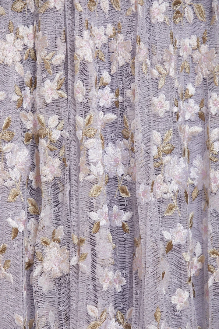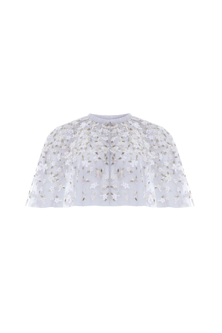 NEW SEASON. The Camellia Ditsy Short Cape in Porcelain Blue. This cape is intricately designed with floral motifs on soft, pretty tulle. Designed to style perfectly over the Camellia Ditsy Strapless Corset Ankle Gown. The perfect versatile styling piece.