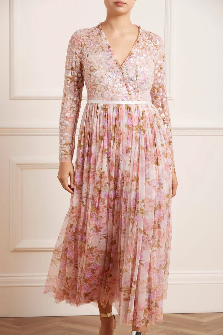 The Darling Meadow V Neck Bodice Ankle Gown in Pink / Multi. This statement gown is beautifully printed with painted flowers and garden motifs, inspired by a vintage French fabric. The bodice is adorned with shimmering, iridescent sequins in romantic floral motifs and features our signature Needle & Thread satin ribbon at the waist. Crafted with layers of tulle creating romantic, delicate movement. The perfect gown for every special occasion.