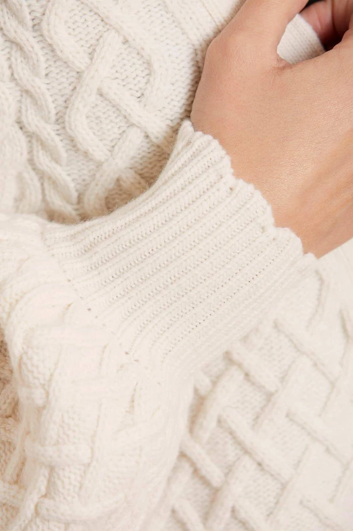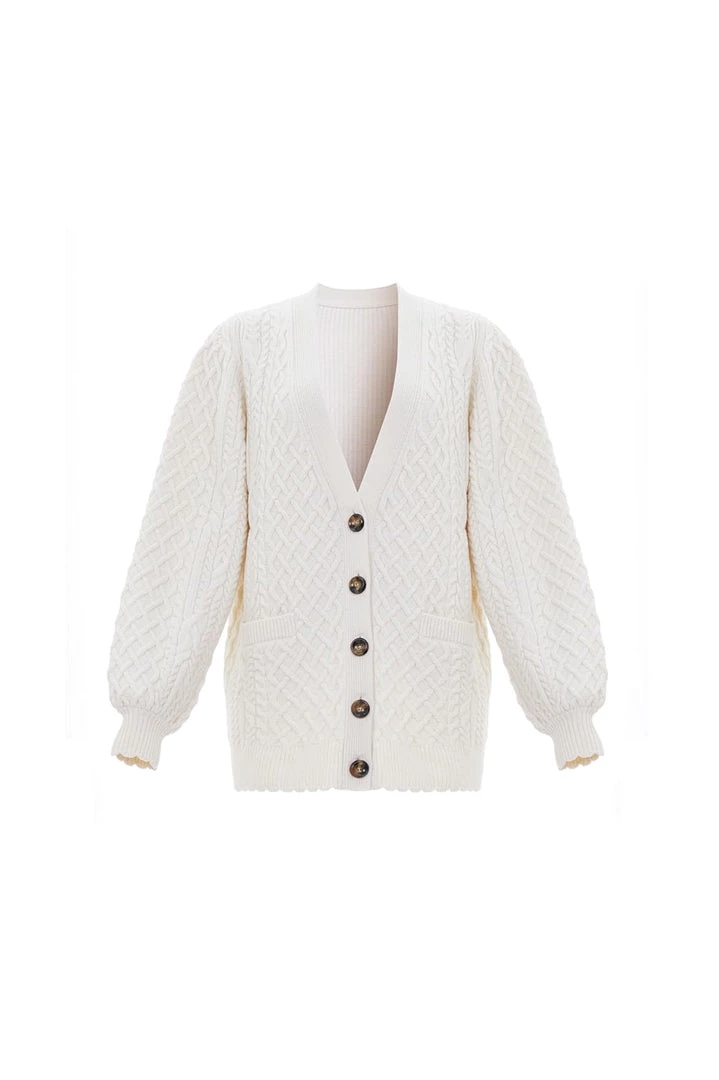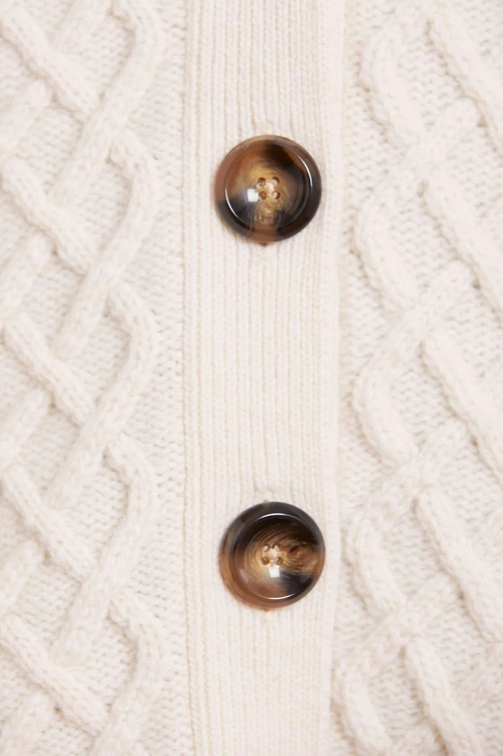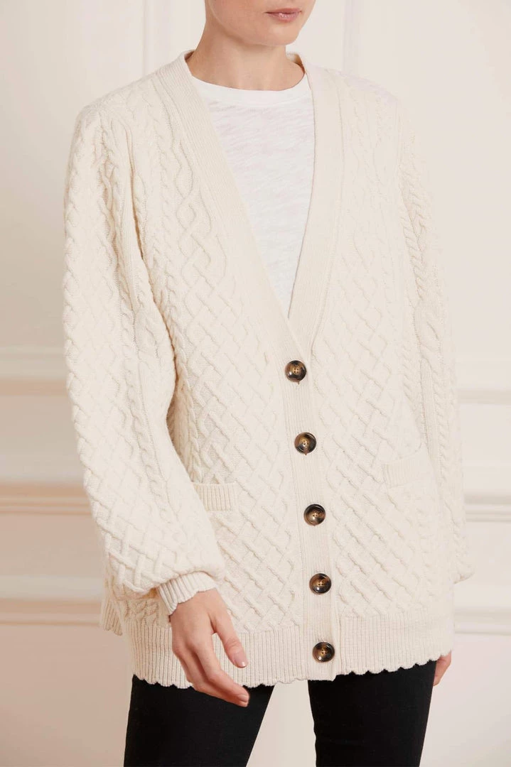 NEEDLE & THREAD EXCLUSIVE. The Elsie Cable Longline Cardigan in Cream. This contemporary cardigan is inspired by vintage knitwear. This soft cardigan is designed in a premium wool blend, including a luxe extra-fine merino wool. Decorated with diamond stitches mixed with twisted cables, creating an intricate textile. Crafted in an oversized fit, relaxed pockets and our signature scallop-shaped detailing at the hem and cuffs. Make this cardigan your go-to layering piece.