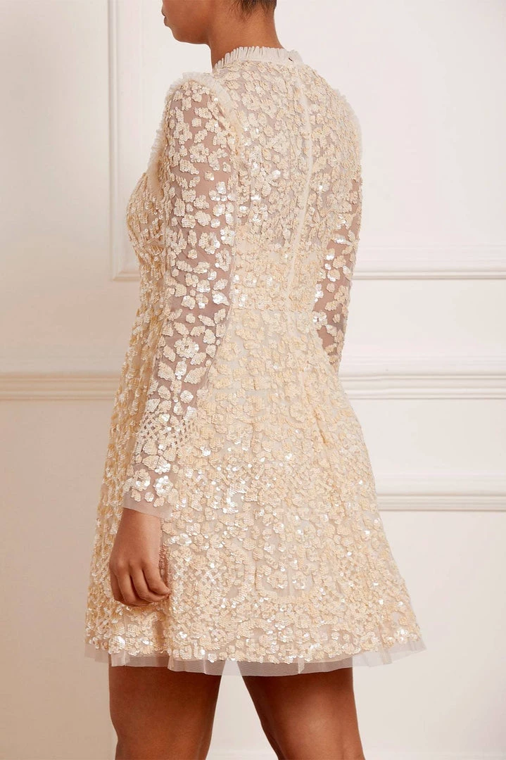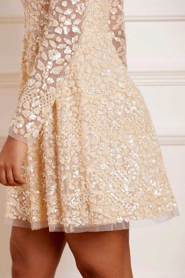 NEEDLE & THREAD EXCLUSIVE. The Floral Daze Sequin Micro Mini in Champagne. A beautiful new silhouette for the season ahead. This mini dress is densely decorated with shimmering sequins inspired by a floral lace tablecloth. Exquisitely designed with a layered, soft net to hold this flattering shape. A truly special piece.