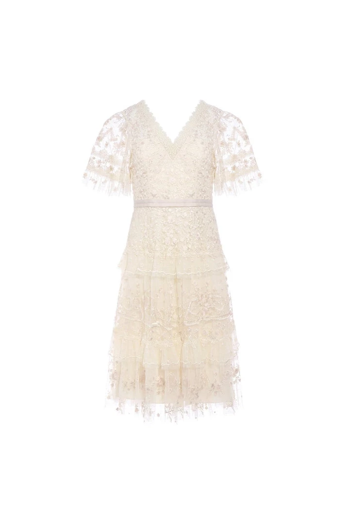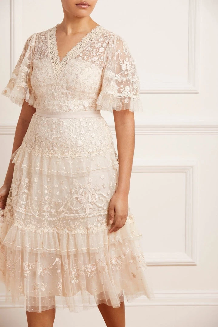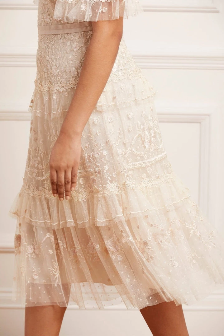 The Francine Midi Dress in Champagne / Pink. This romantic midi dress is inspired by traditional Wedgwood ceramics, featuring subtly contrasting embroidery and lace trim details. Adorned with floral artwork and delicate trailing highlights, creating a soft texture. Expect all eyes on you in the Francine.