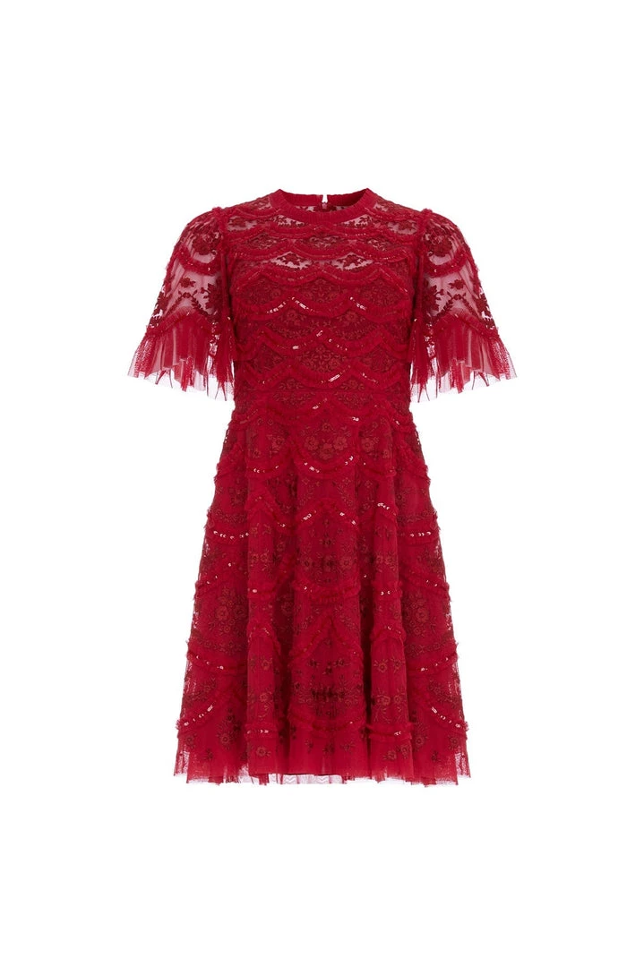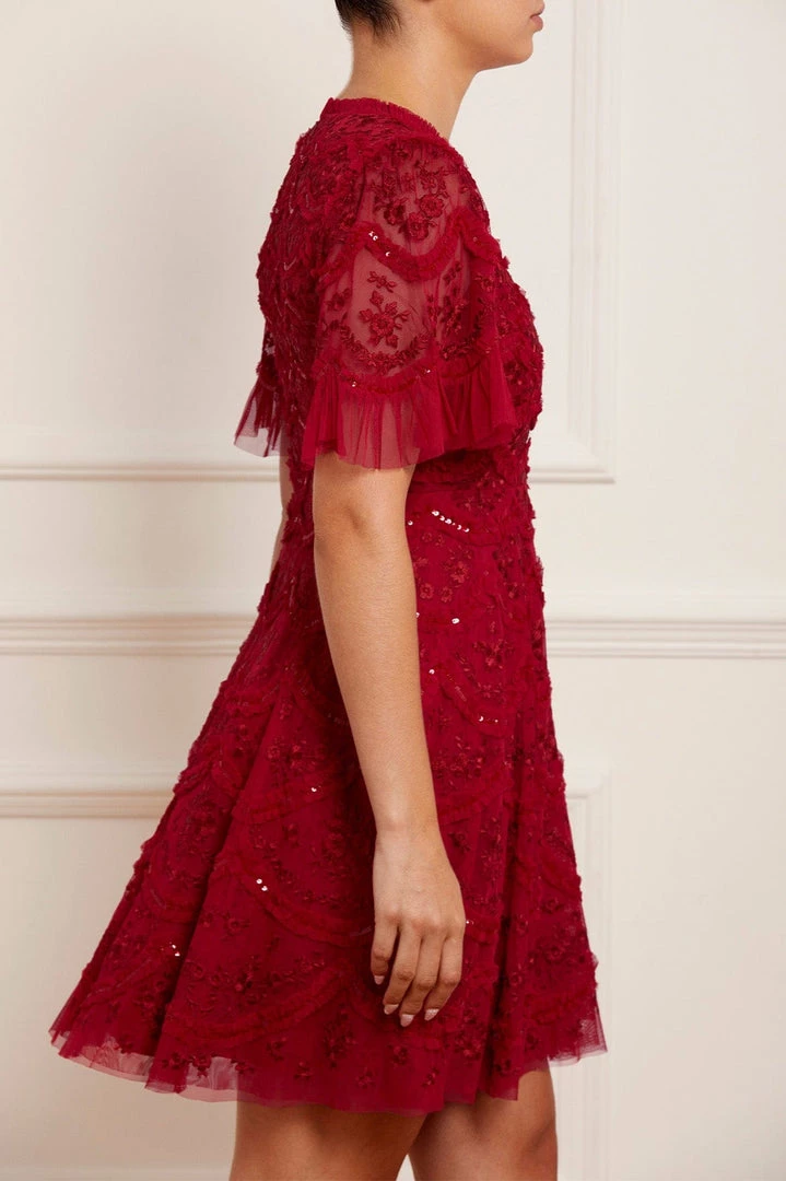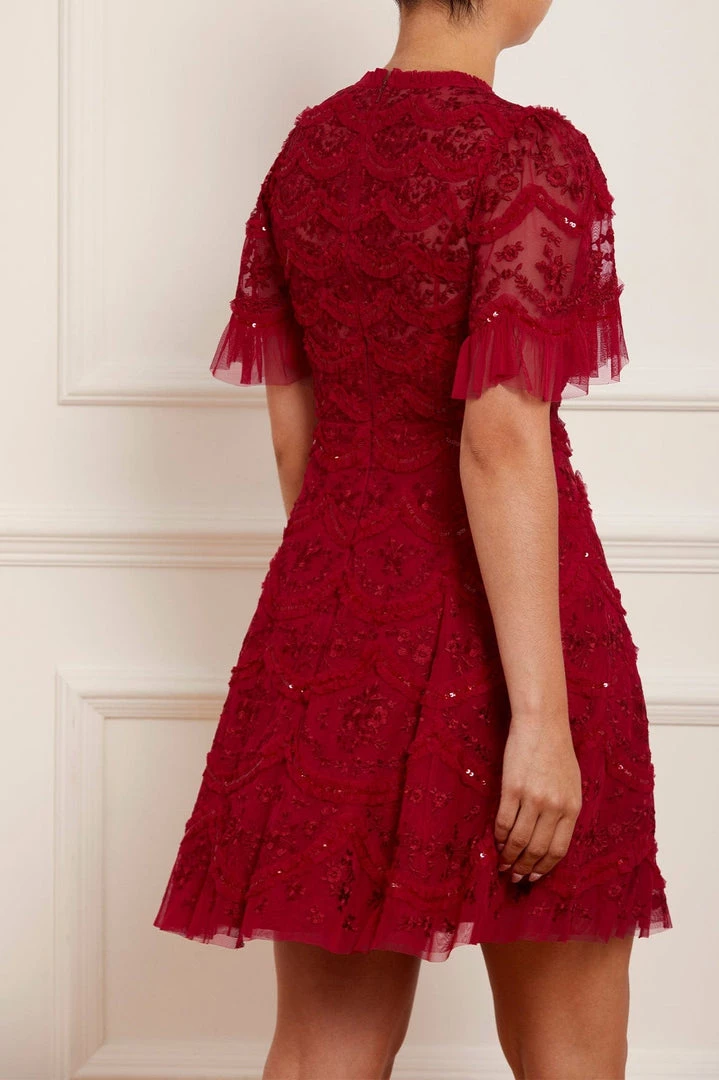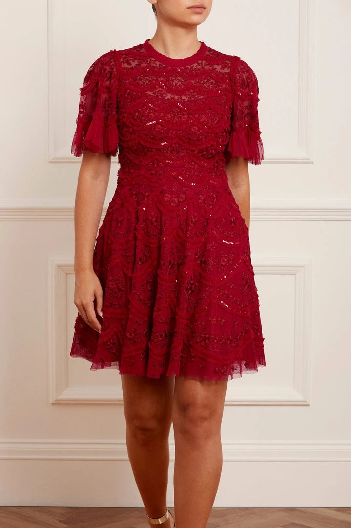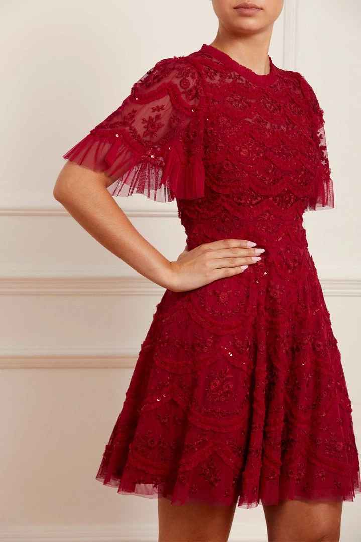 NEW SEASON. The Lily Bloom Mini Dress in Deep Red. This mini dress is beautifully designed with delicate tulle ruffles and soft scallop shaping for signature Needle & Thread styling. Adorned with intricate tonal floral embroidery and trimmed with high shine sequins to add shimmer throughout. Make the Lily mini dress your new wardrobe addition.