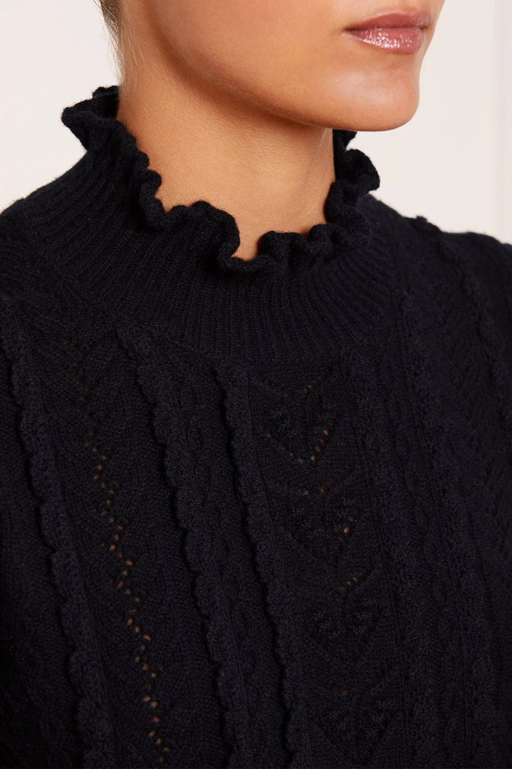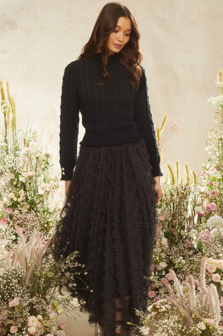 NEEDLE & THREAD EXCLUSIVE. The Mixed Stitch Crochet Trim Short Jumper in Black. Crafted from soft wool, this jumper features a neckline inspired by vintage Victoriana high neck blouses. Decorated with delicate hand crochet trims, it has a fitted silhouette and mixed cable and bobble details, plus faux pearl and crystal buttons on the cuff for feminine styling. Make this sweater your new season go-to.