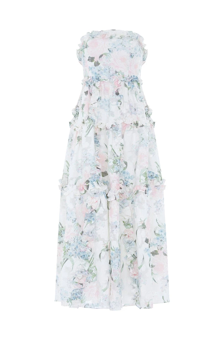 The Posy Blossom Corset Ankle Gown in Moonshine. This corset gown is developed beautifully from jacquard fabric with a romantic floral artwork. Designed with a flattering silhouette featuring a generous skirt, a supportive integrated corset and engineered ruffles throughout. The corset is paneled with a power mesh fabric to hold the silhouette and also allow movement. The perfect gown to take you from day to night.