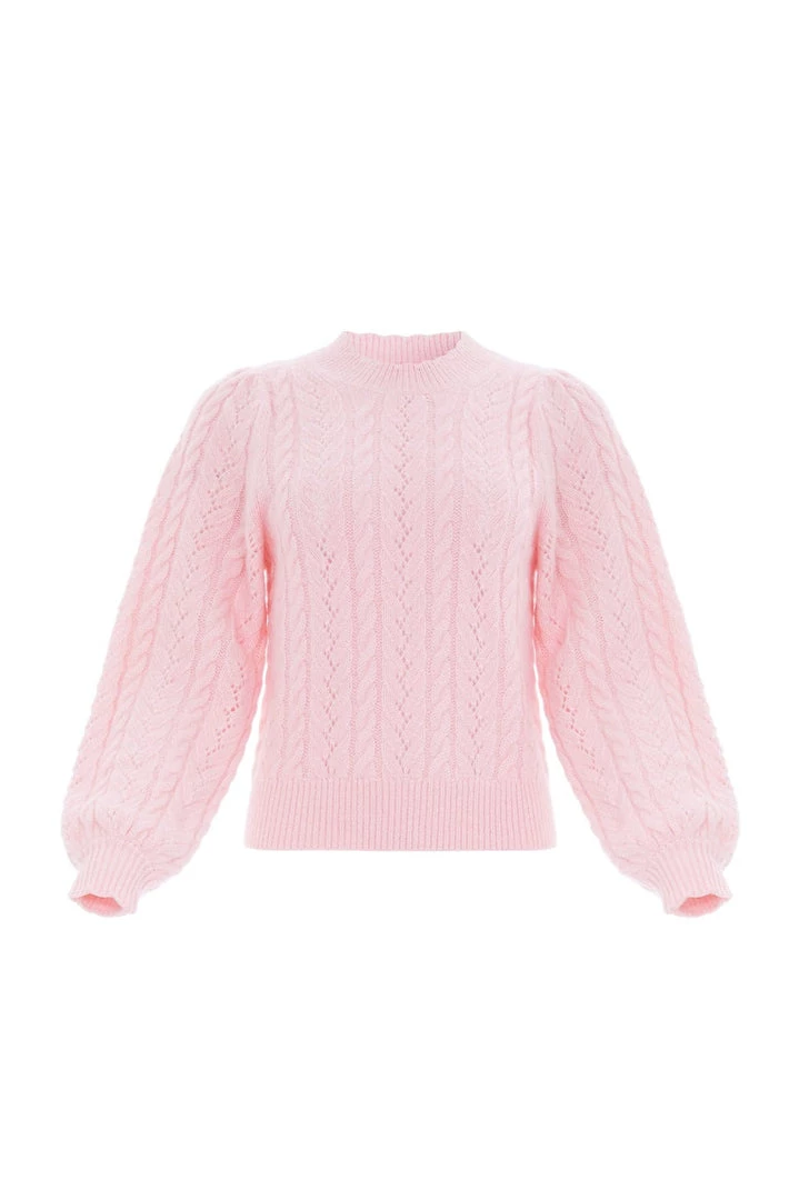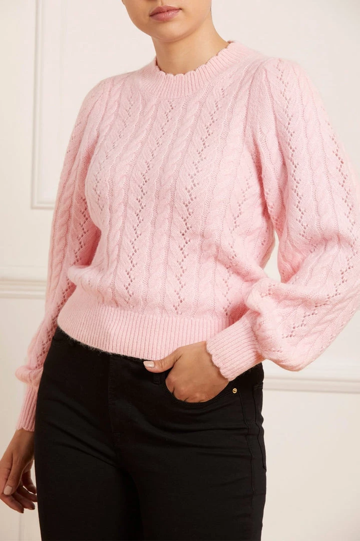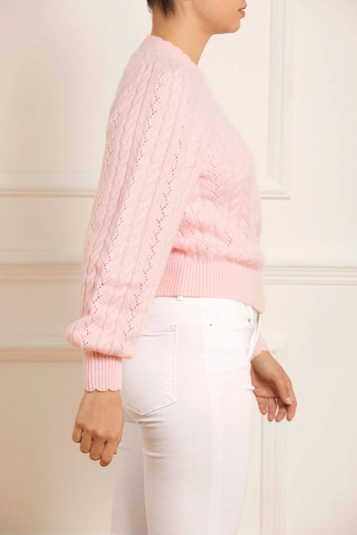 The Pretty Cable Mid-Line Jumper in Ballerina Pink. A brand new colour for the season ahead. This soft jumper is developed from alpaca-blend yarn, creating a fluffy texture. Adorned delicately with intricate cable designs and lace pointelle detailing. This jumper is designed with generous, full sleeves and an easy body fit. Make this effortless style your new wardrobe staple.