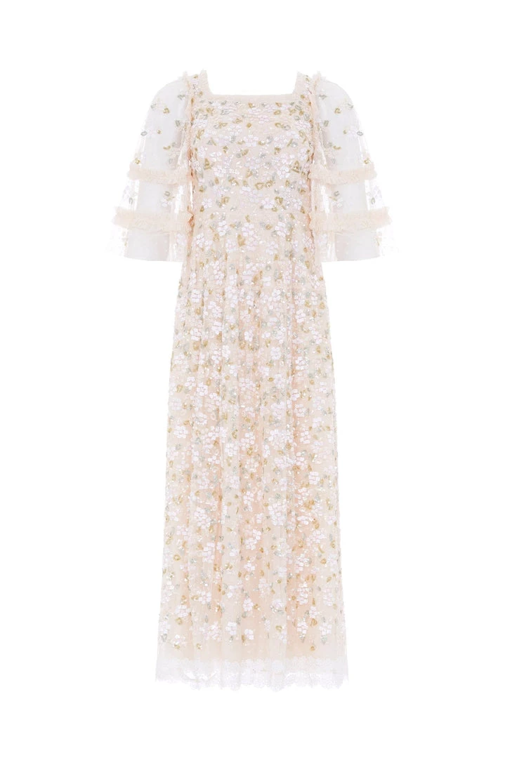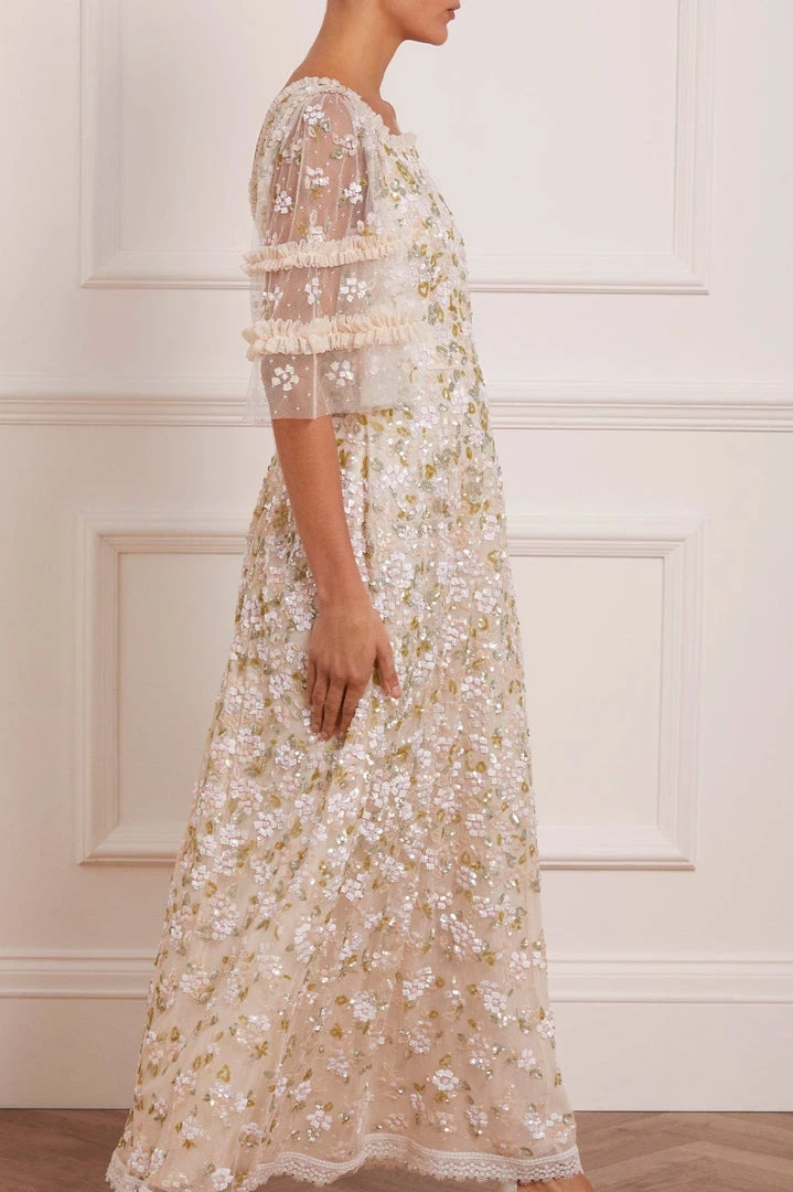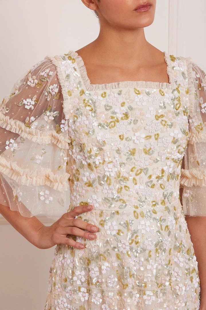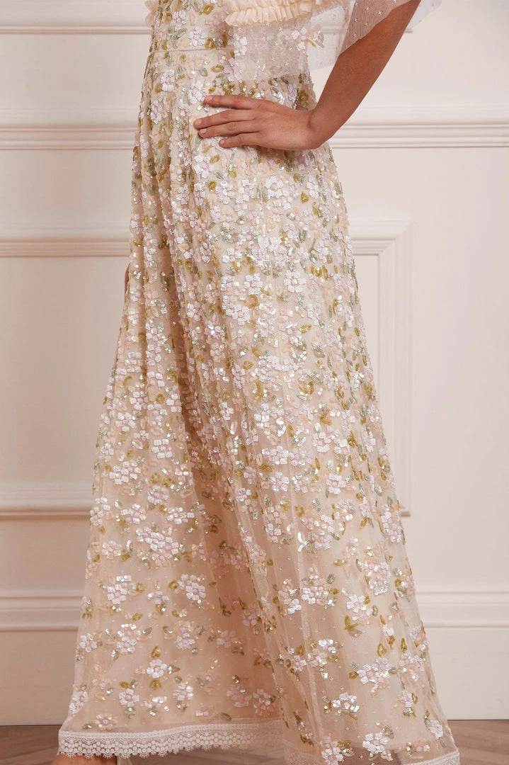 The Pretty Petals Ankle Gown in Champagne / White. This gown is heavily adorned with sequin floral motifs throughout. Designed with a high, square neckline and couture-inspired skirt to create a truly classic piece. The skirt is developed with a net layer to hold this flattering shape. Make a statement in the Pretty Petals gown.