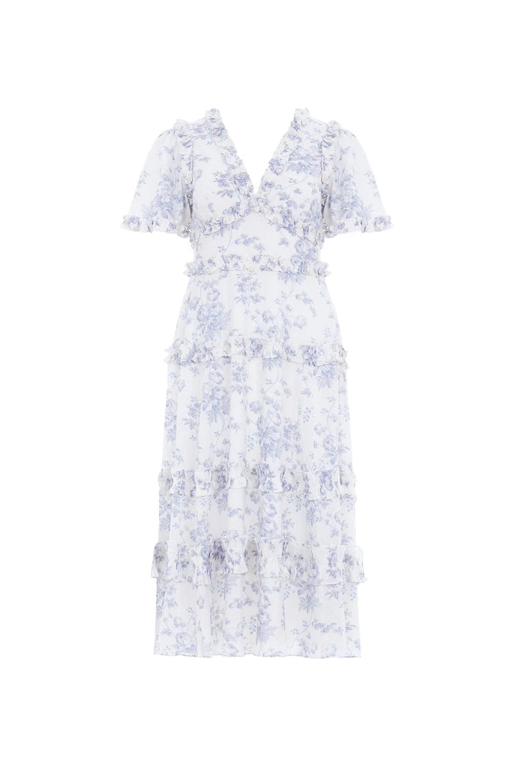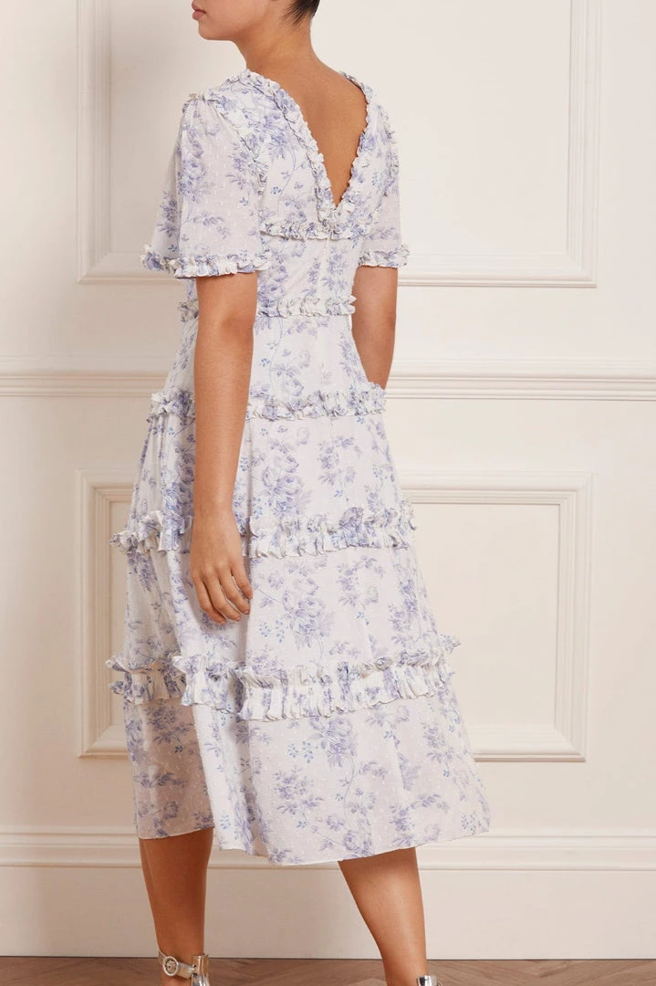 NEW SEASON. The Rambling Roses Cotton Midaxi Dress in Moonshine. This cotton dress is printed with intricate hand-drawn artwork inspired by an early 1900’s design. Beautifully crafted with textured soft cotton and adorned with subtle, signature ruffles for romantic texture. Decorated with perfectly positioned ruffles on the tier of the skirt for signature styling. The perfect piece to breeze through the summer months.