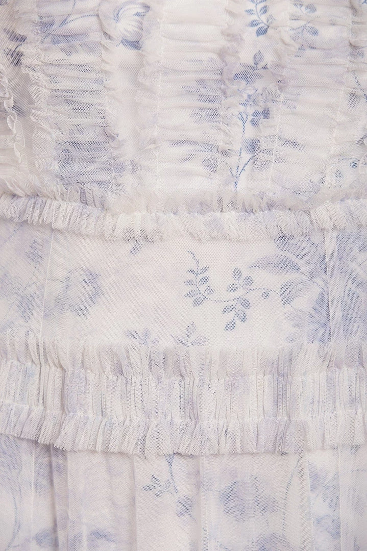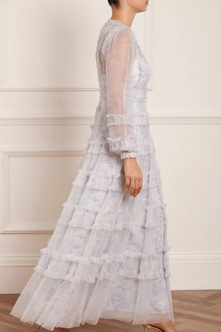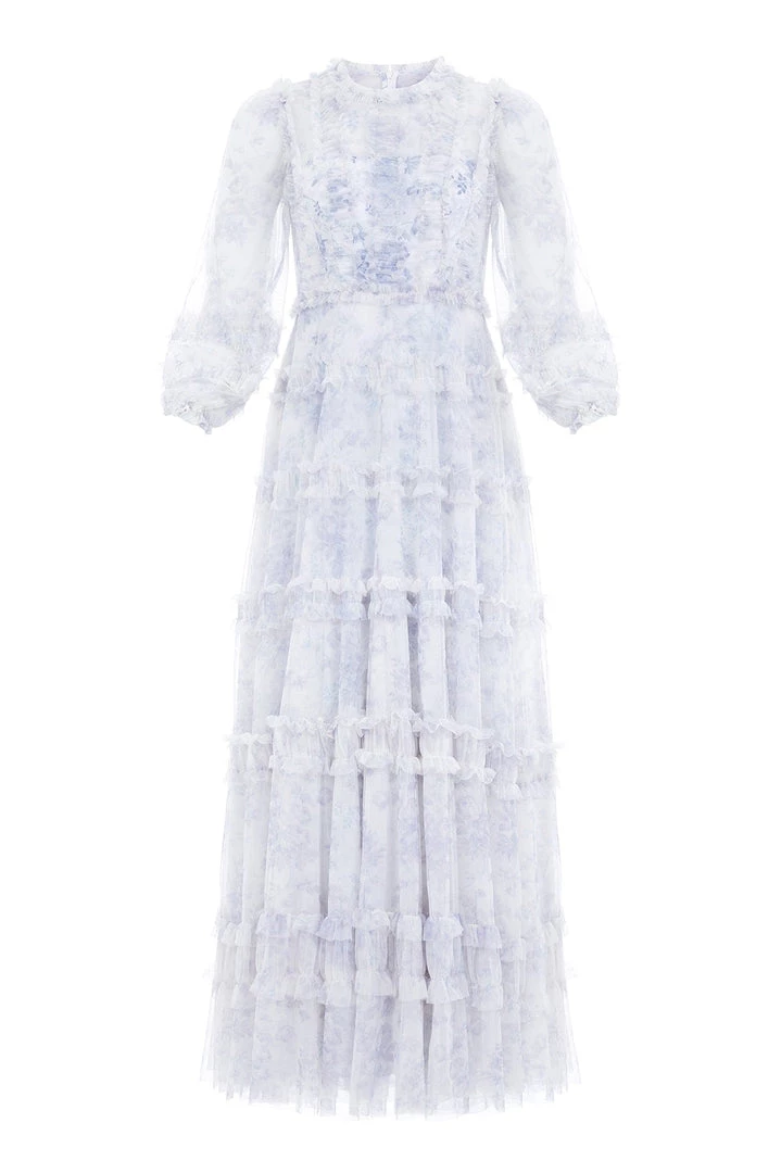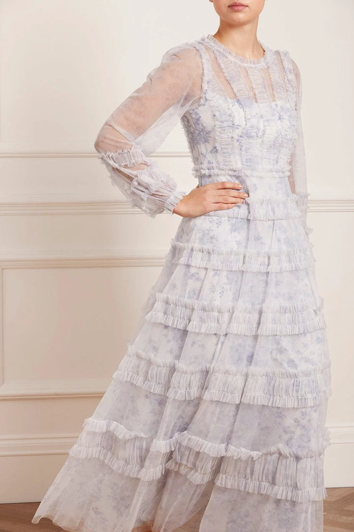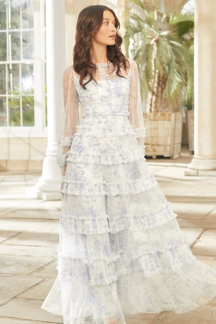 NEW SEASON. The Rambling Roses Gown in Moonshine. This gown is printed with intricate hand-drawn artwork inspired by an early 1900’s design. Beautifully crafted with pretty tulle and double stitched frills adorning the silhouette for romantic texture throughout. The perfect gown for all your upcoming events.