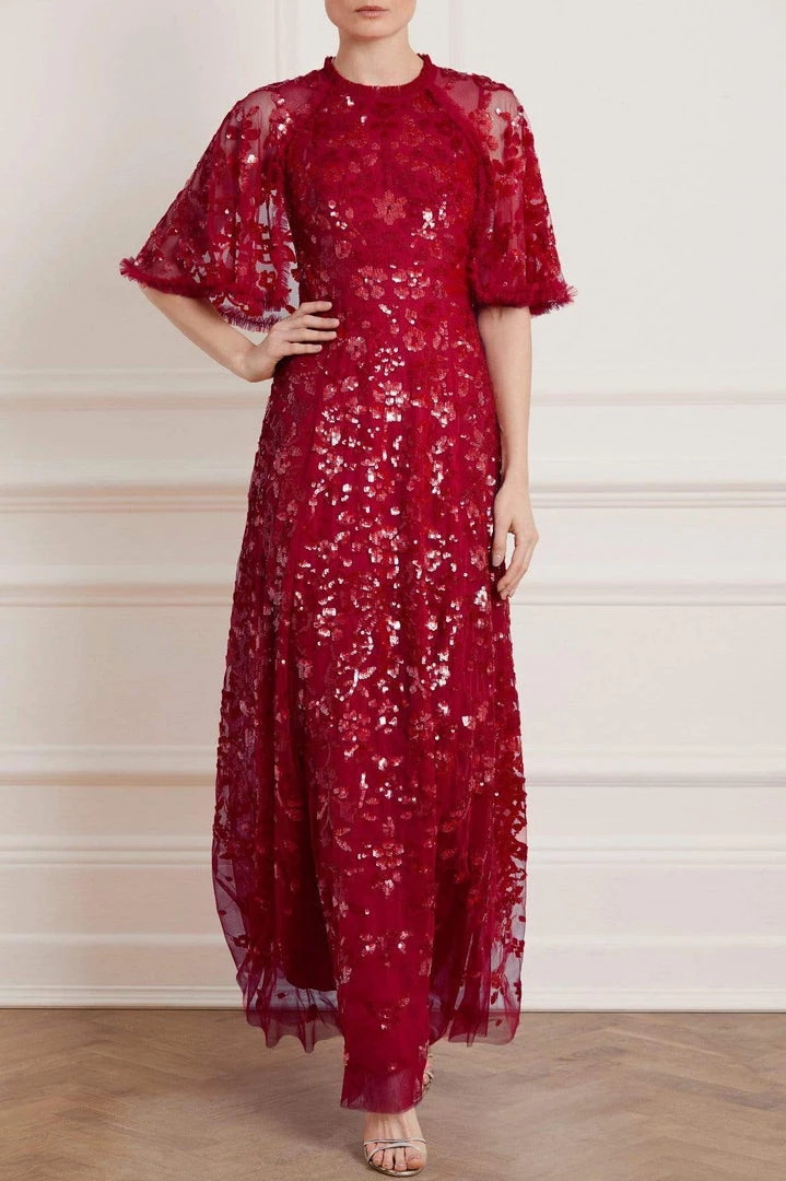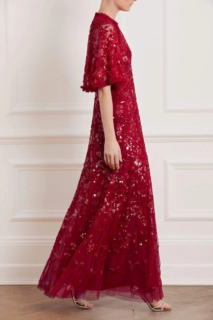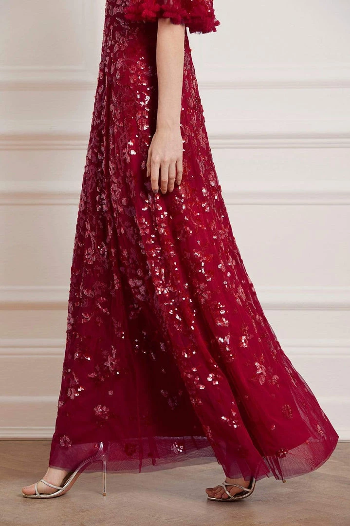 The Sequin Ribbon Gown in Deep Red. This gown is inspired by key styling details of the 1930s. Beautifully designed with cape sleeves that gracefully fall over the shoulders, adding romantic coverage to the arms. Decorated with a floral lace artwork in lustrous tonal sequins, creating an all-over shine. The artwork is inspired by a Victorian lace fan, which features floral and bow motifs. Shine under the spotlight in this elegant gown.