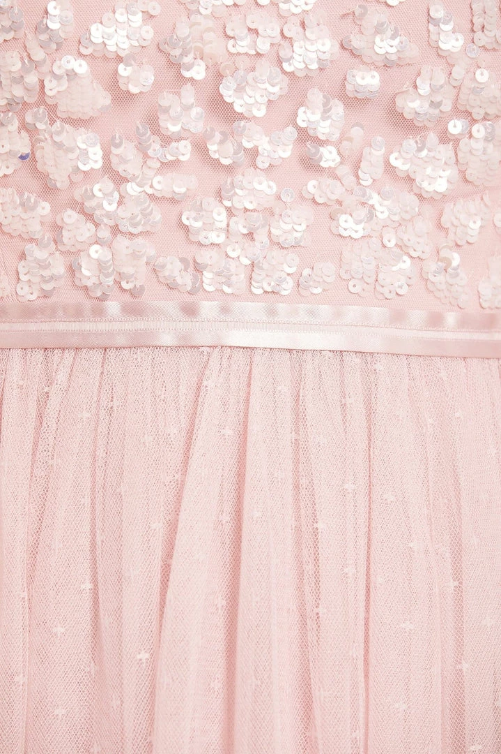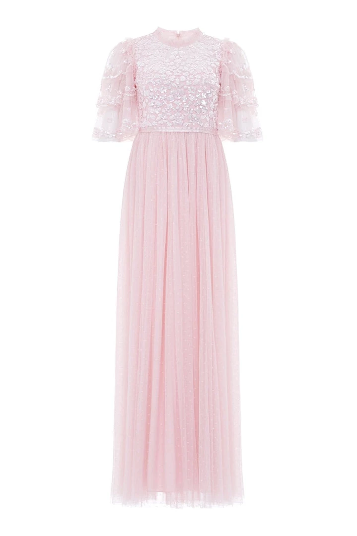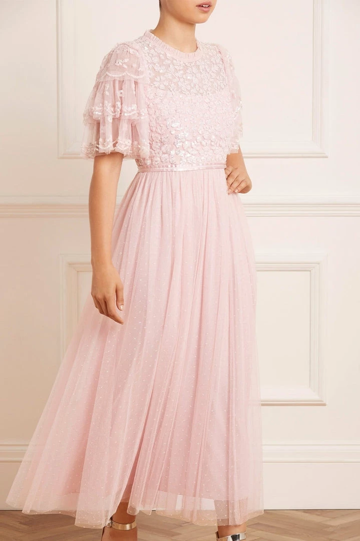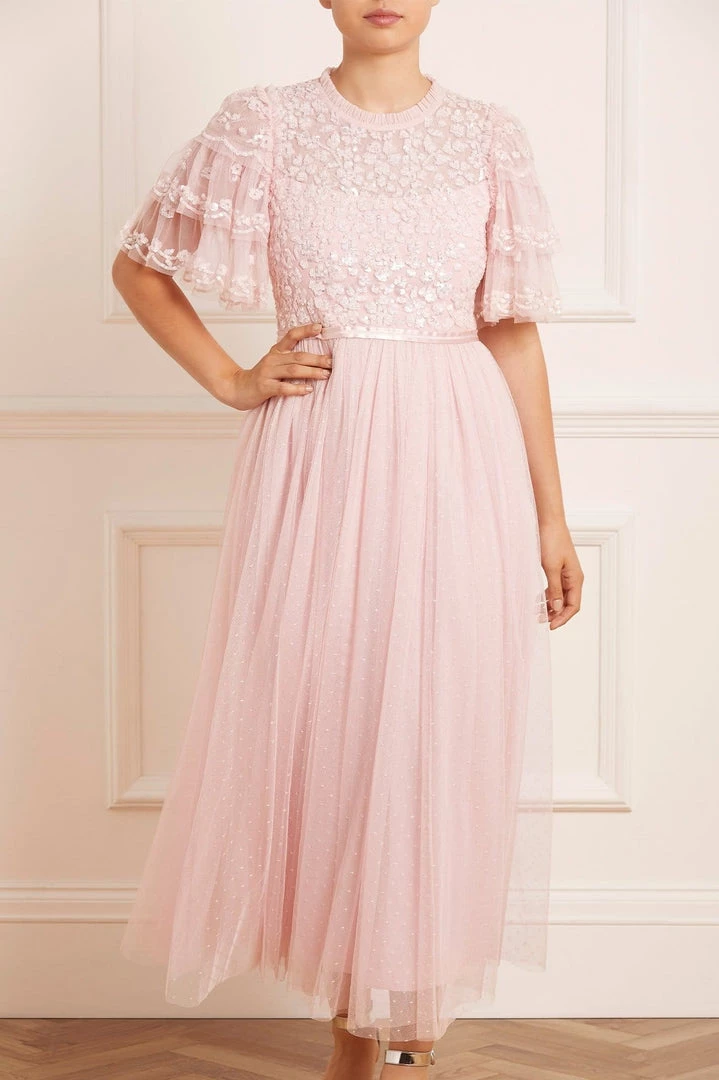 The Seren Bodice Ankle Gown in Ballerina Pink. This statement piece boasts romantic, layered, frill sleeves, with each tier separately adorned with glistening sequins delicately bordering the edge. Beautifully decorated on the bodice with floral motifs in tonal sequins to create an all-over shimmering effect. Designed with a multi-layered kisses tulle skirt, our signature Needle & Thread silhouette, and a ribbon waistband. A show-stopping dress for all occasions.