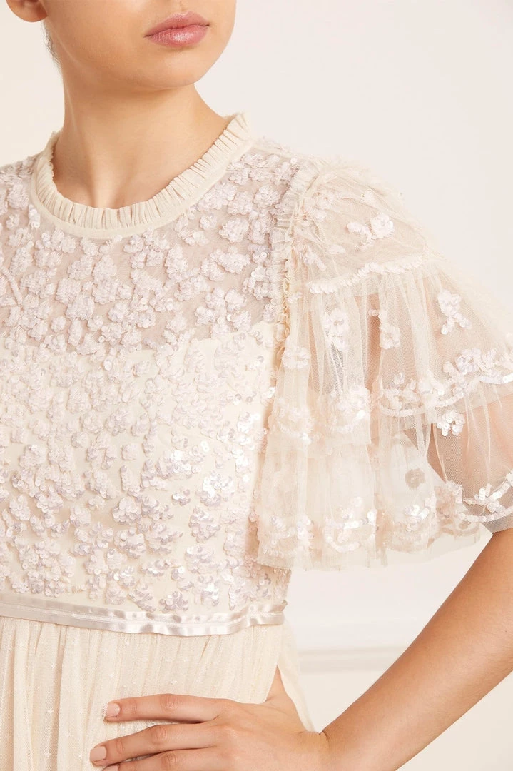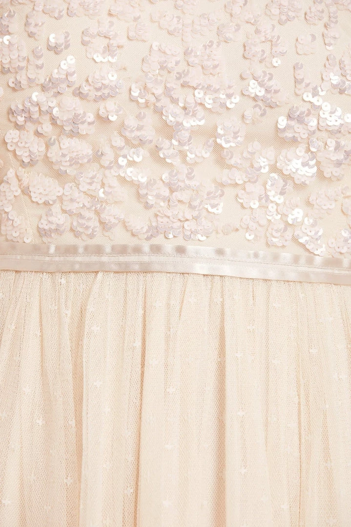 The Seren Bodice Ankle Gown in Champagne / Pink. This statement piece boasts romantic, layered, frill sleeves, with each tier separately adorned with glistening sequins delicately bordering the edge. Beautifully decorated on the bodice with floral motifs in tonal sequins to create an all-over shimmering effect. Designed with a multi-layered kisses tulle skirt, our signature Needle & Thread silhouette, and a ribbon waistband. A show-stopping dress for all occasions.