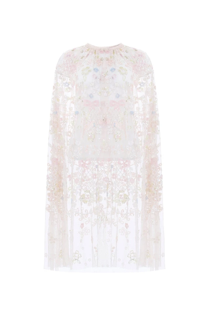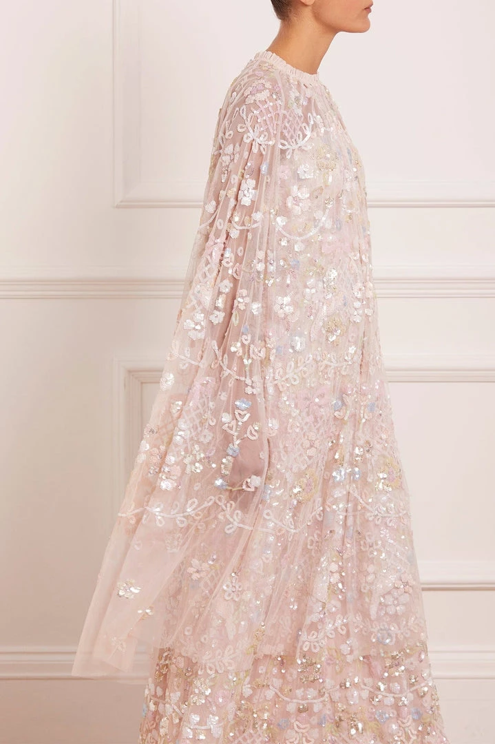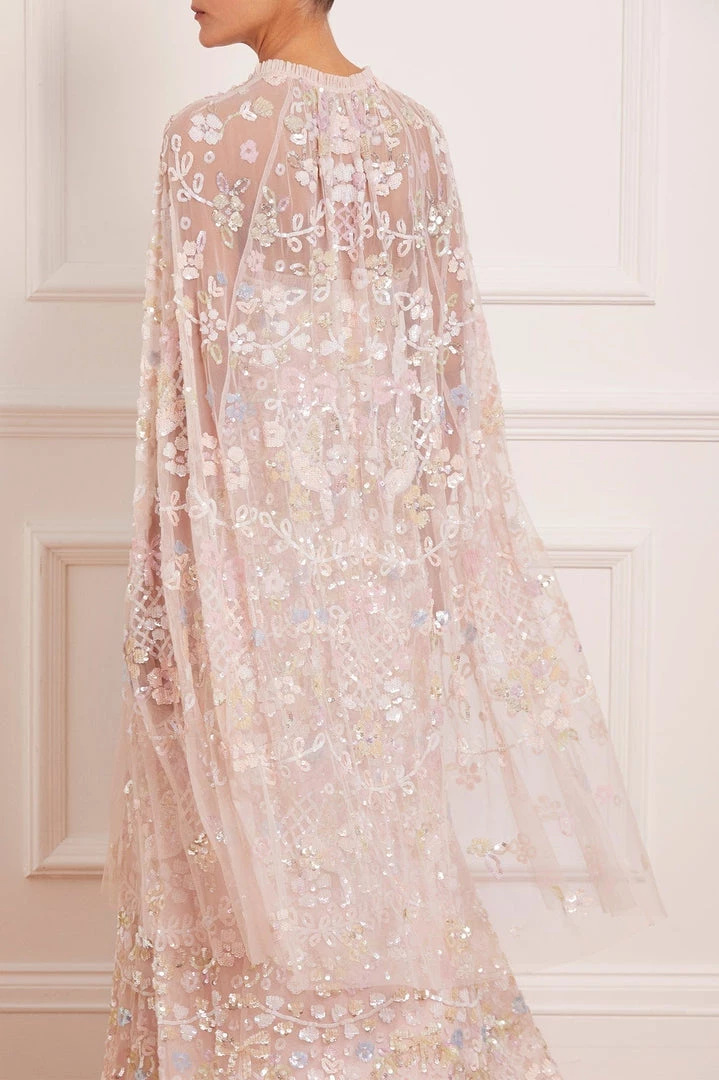 NEW SEASON | NEEDLE & THREAD EXCLUSIVE. The Shimmer Fairytale Midaxi Cape in Petal Pink / Sundaze. Intricately adorned with a multi-coloured floral and bird artwork with shimmering sequins to create a romantic look. Beautifully crafted from delicate, soft tulle and signature ruffle detailing throughout featuring an easy hook and bar finish at the neckline. The perfect styling piece to layer over the Shimmer Fairytale Corset Gown.