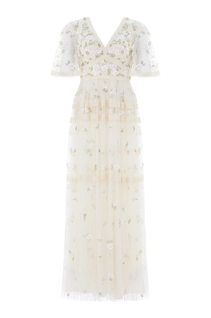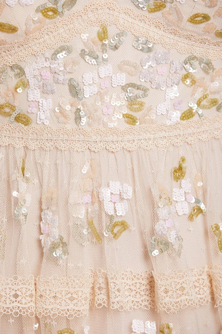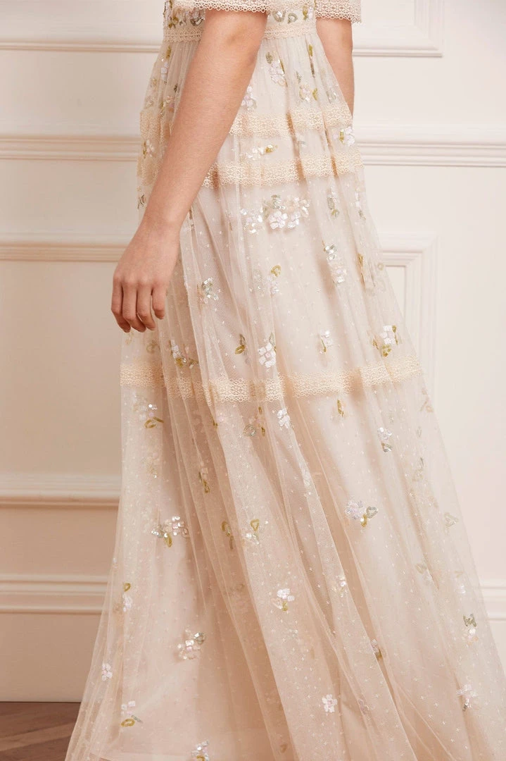 NEW SEASON | NEEDLE & THREAD EXCLUSIVE. The Shimmer Primrose Gown in Champagne / White. This gown is adorned with small floral motifs in shimmering sequins scattered throughout. Intricately designed with lace trim edges along the hem, romantic cut sleeves and a layered tulle skirt. The perfect gown for every occasion.