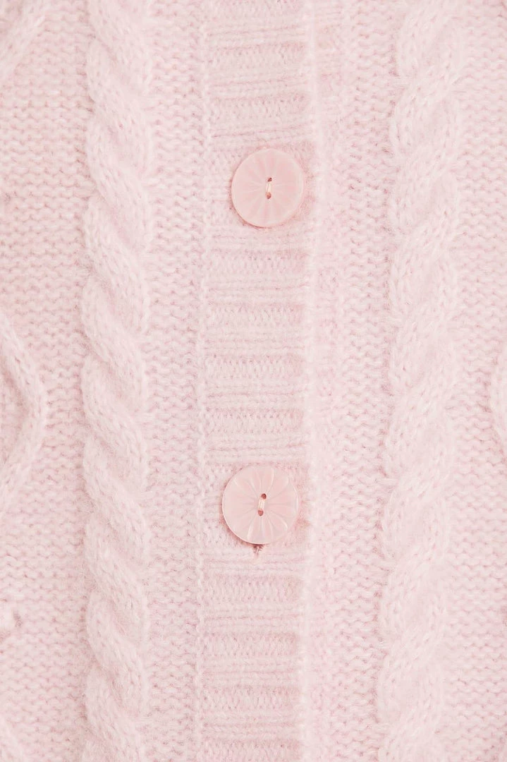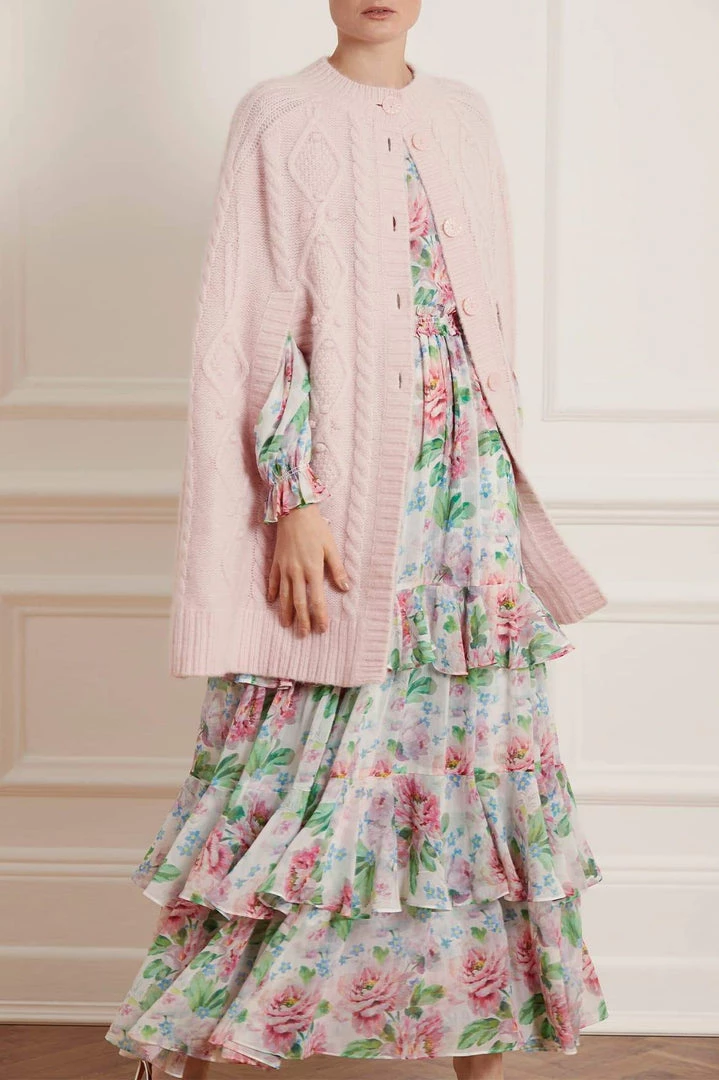 NEEDLE & THREAD EXCLUSIVE. The Sylvie Cable Cape in Light Pink. This premium knitwear piece is designed in a super-soft, fluffy alpaca-blend yarn. This cosy cape is crafted with a mix of diamond-shaped cables and twists in an intricate textile. Adorned with subtle, playful flower bobbles adding a feminine texture. Designed with longer sleeves, split openings and volume to create a romantic style statement. Make the Sylvie cape your ultimate fashion piece this season.