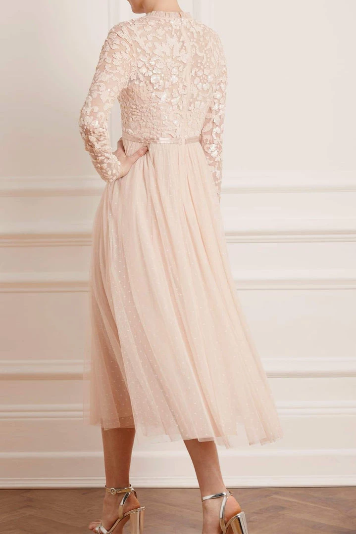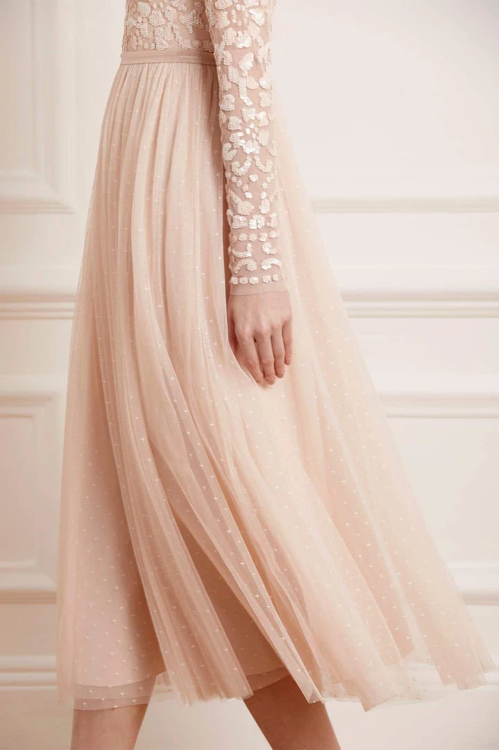 NEEDLE & THREAD EXCLUSIVE | The Tempest Bodice Ballerina Dress in Strawberry Icing. This beautiful ballerina dress is inspired by a vintage lace tablecloth design, embellished with shimmering pink sequins all over the bodice. Designed with long sleeves, a kisses tulle multi-layered skirt and frill trim detailing around the neck. Make an entrance in the Tempest.