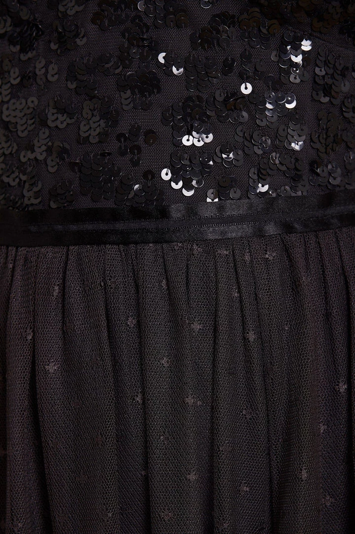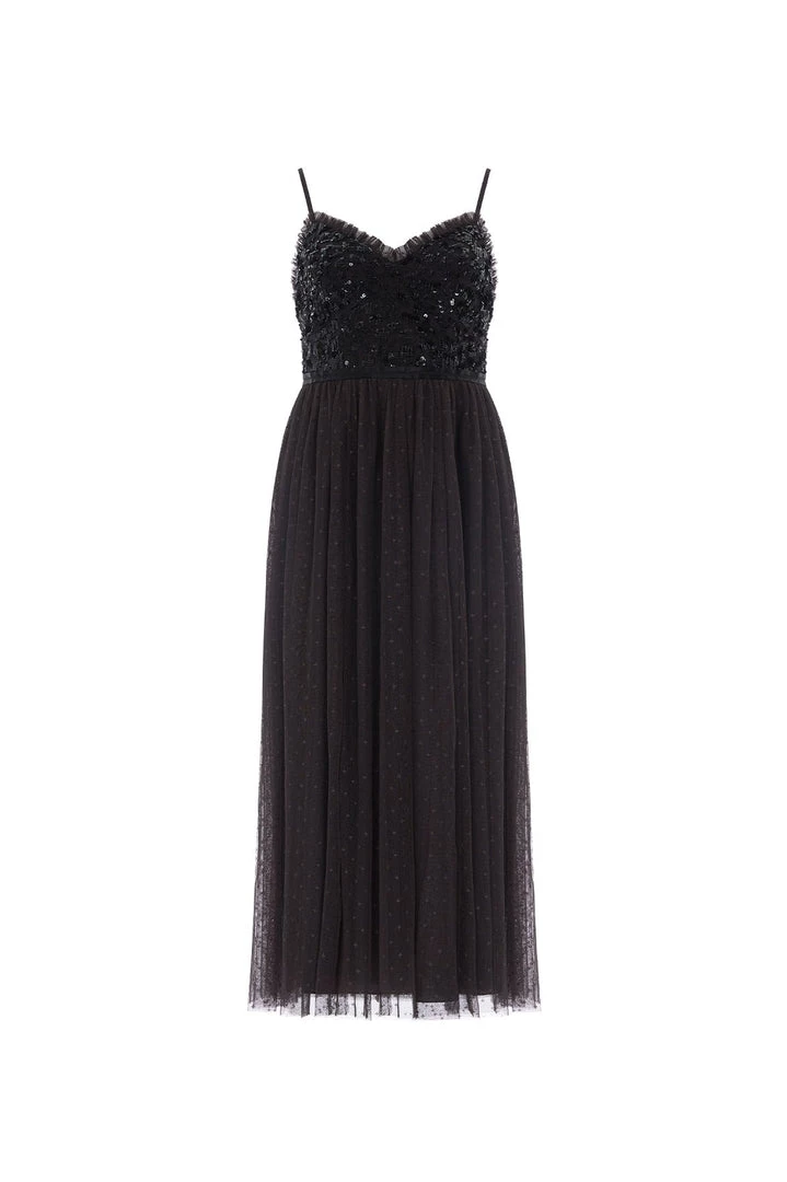 The Tempest Bodice Cami Ballerina Dress in Graphite. This beautiful Dress is inspired by a vintage lace tablecloth design. Its bodice is adorned with sequins, creating an all-over shimmer effect. Crafted with short strap sleeves, a tulle multi-layered skirt and frill trim detailing around the neck. Make an entrance in the Tempest.