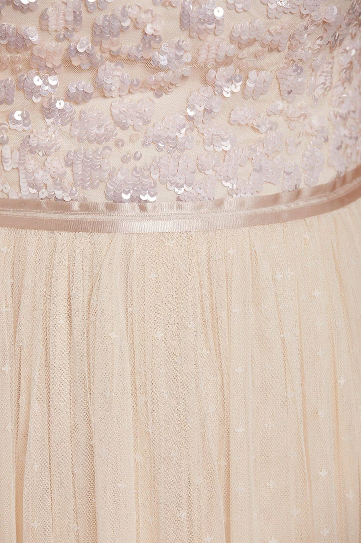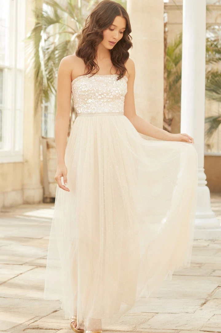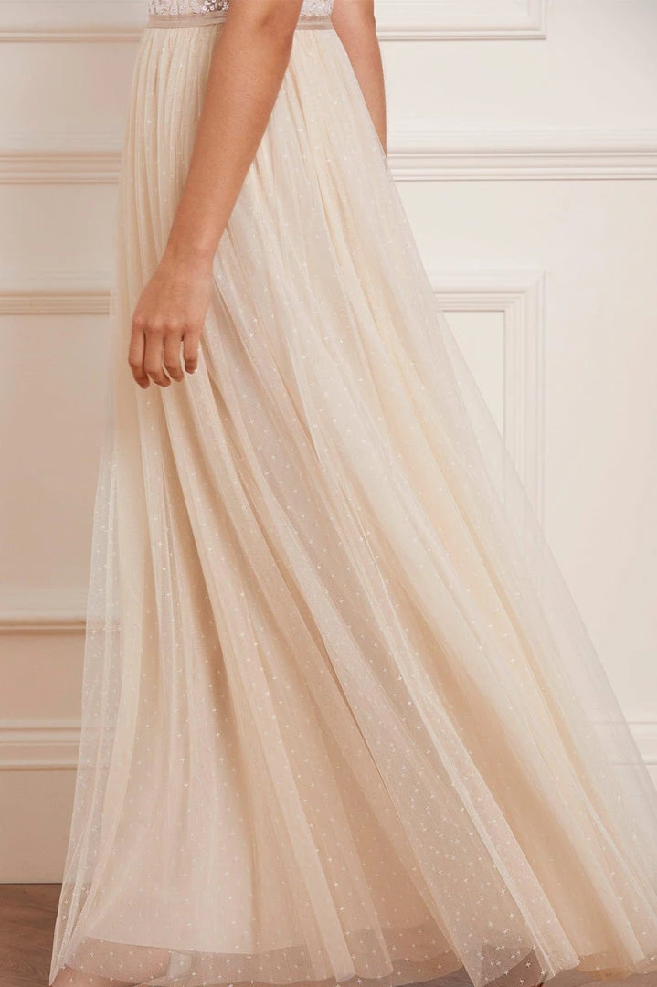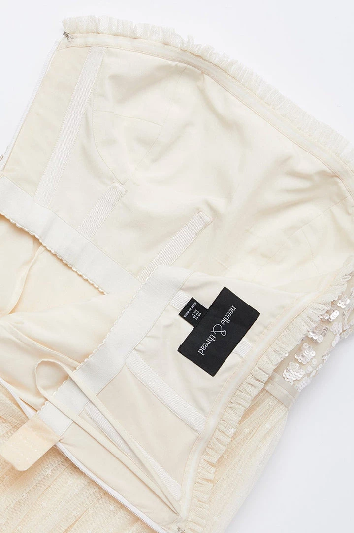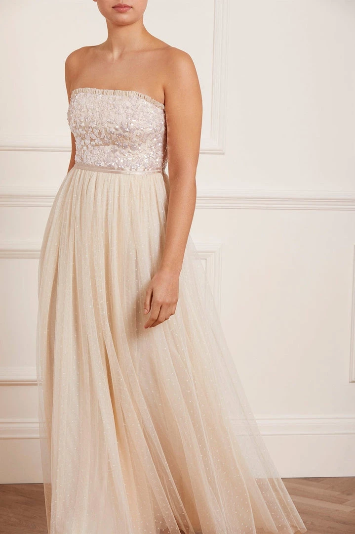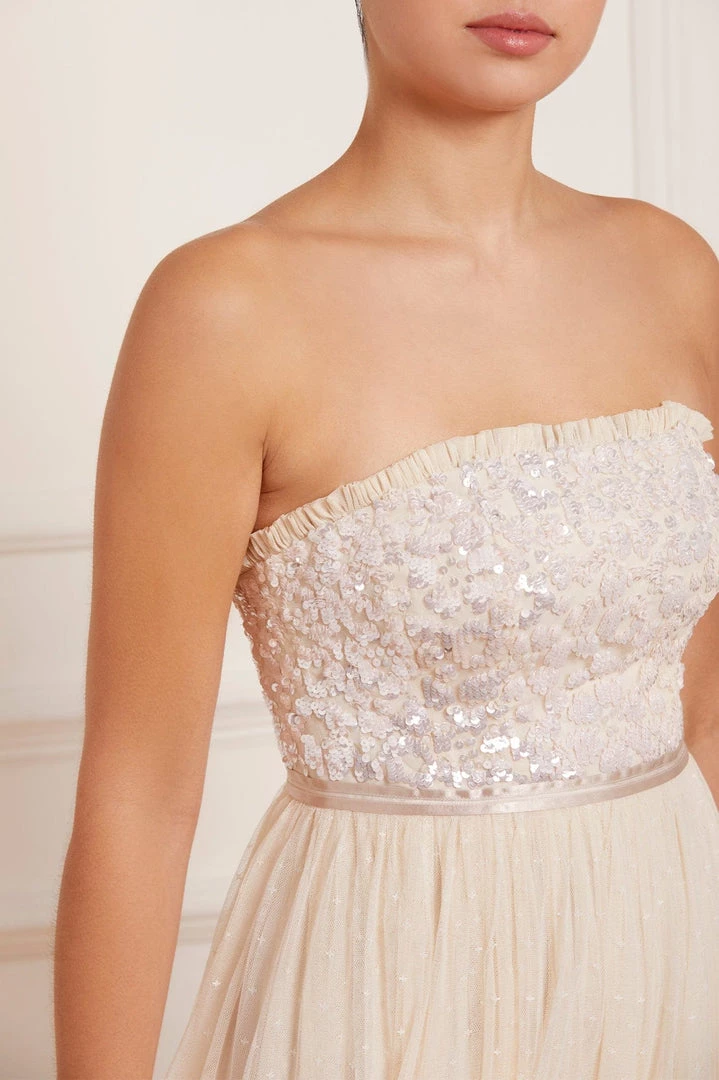 NEW SEASON. The Tempest Strapless Corset Bodice Gown in Champagne/Pink. The bodice of this gown is embellished with shimmering, iridescent sequins in romantic floral lace motifs. Designed with an integrated corset made with ribbon stitching, soft boning and panels of stretch mesh fabric for comfort and security in the fit. Crafted with layers of signature kisses tulle creating romantic movement as you walk. A true fairytale piece in the collection.