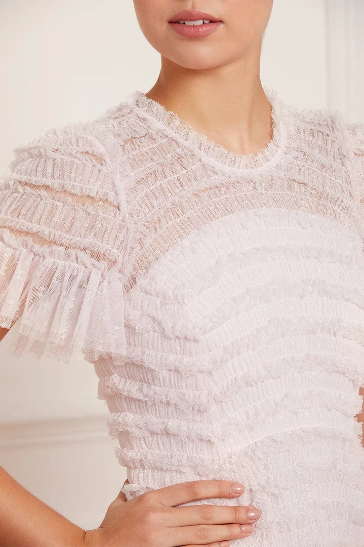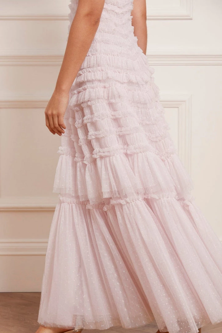 NEW SEASON. The Valentine Ruffle Gown in Powder Pink. A signature Needle & Thread style developed with textile ruffles and flattering tulle, creating a romantic look. The ruffles cascade down the dress, starting smaller and gradually getting bigger towards the hem to create soft, fluid movement. Crafted from our signature Needle & Thread kisses tulle. Make a statement in the Valentine.