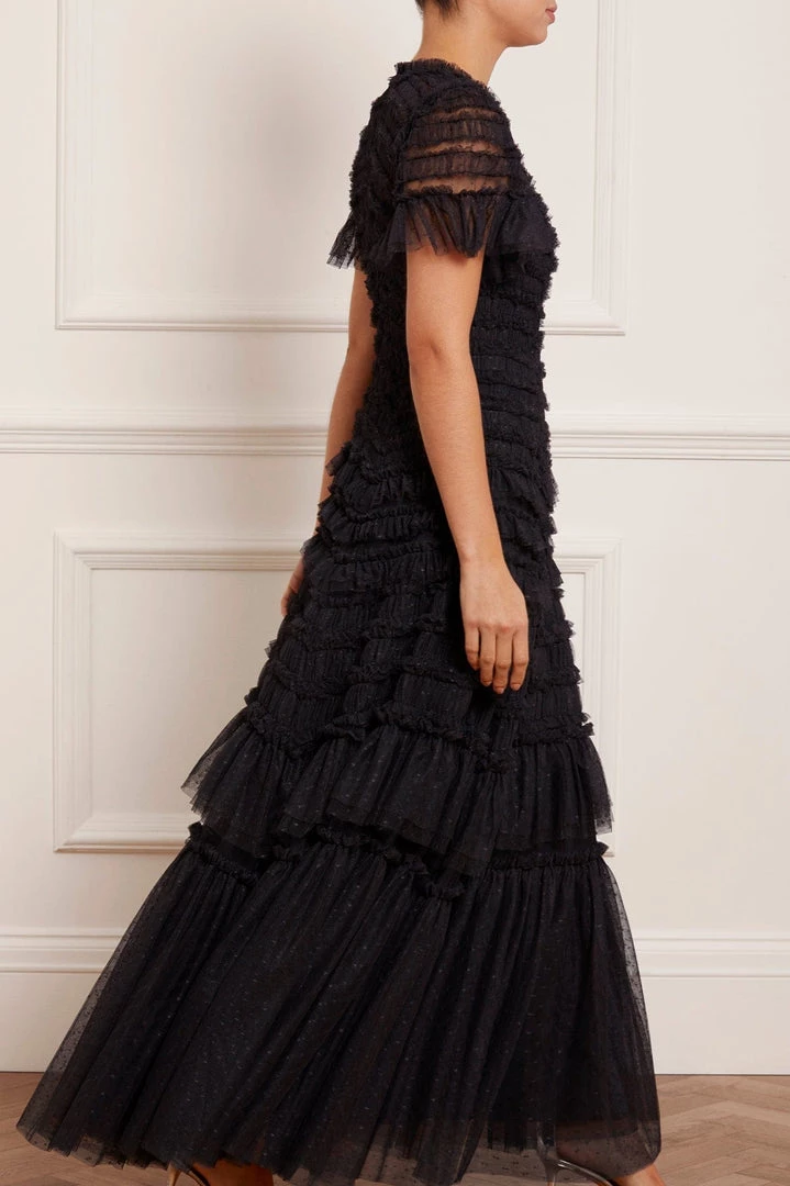 NEW SEASON. The Valentine Ruffle Gown in Graphite. A signature Needle & Thread style developed with textile ruffles and flattering tulle, creating a romantic look. The ruffles cascade down the dress, starting smaller and gradually getting bigger towards the hem to create soft, fluid movement. Crafted from our signature Needle & Thread kisses tulle. Make a statement in the Valentine.