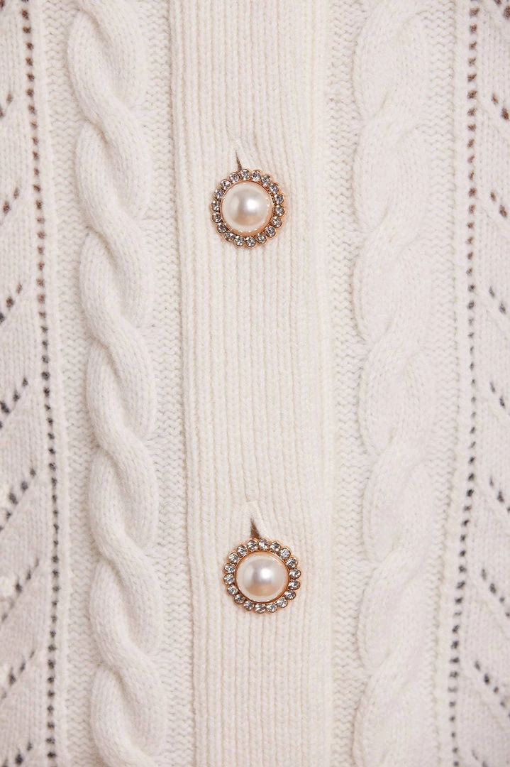 NEEDLE & THREAD EXCLUSIVE. The Victoriana Cape in Cream. This beautiful cape is made from soft wool and decorated with faux pearls and crystal-embellished buttons for a luxe finish. It features delicate stitches, mixed cables and bobbles. Make this feminine cape your new styling piece.