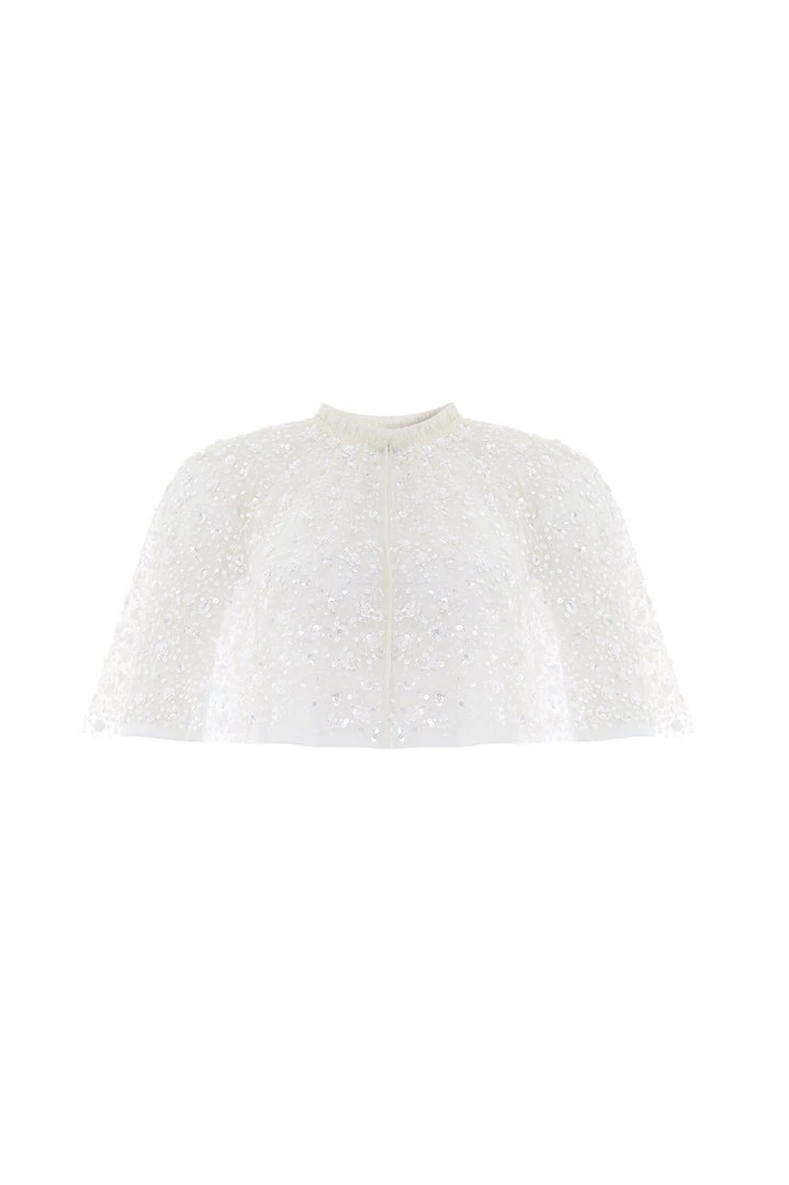 NEW SEASON. The Violet Shimmer Short Cape in Champagne. This cape is delicately scattered with a shimmering sequin artwork. Beautifully developed from pretty, kisses tulle for signature Needle & Thread detailing. This cape sits perfectly over the Violet Shimmer Strapless Corset Gown. Make this cape your new styling piece.