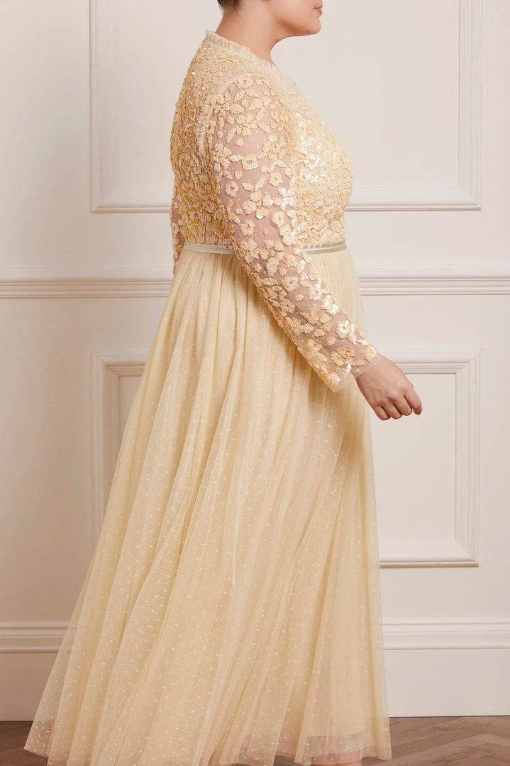 The Amalie Bodice Long Sleeve Ankle Gown in Buttercup. Featuring a bodice decorated with intricate shimmering sequins and floral motifs, this gown is designed with a layered tulle skirt featuring ‘x’ kiss motifs throughout, adding subtle texture. Make this gown your new season go-to.